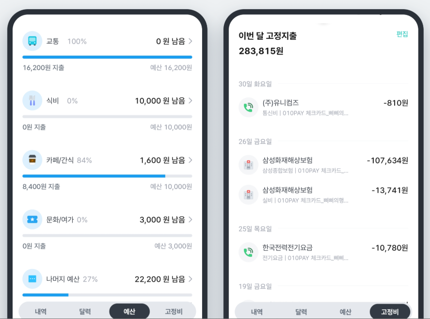 뱅크샐러드 | 모든 카드 지출 자동 집계, UI 편리 | 간혹 결제 반영 지연 |